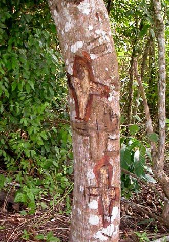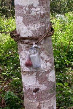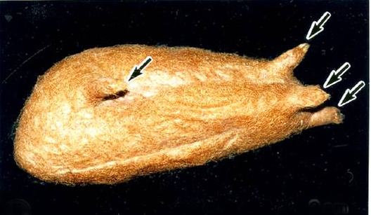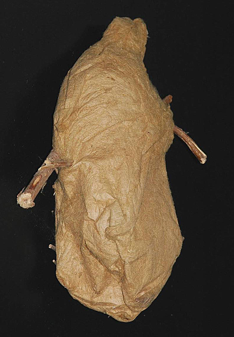 The Anaphe nest is the most complex, communally-built structure yet described for a social caterpillar. In addition to its multilayered outer shell, the nest is provisioned with one or more openings (arrows) which allow the moths to escape. These openings are often turret-like as indicated by the three arrows on the right. As shown in the insert, the hard inner layer of the nest is interrupted at these sites facilitating the escape of the moth. The caterpillars of the saturniid Hylesia acuata but nothing is known of its internal structure.