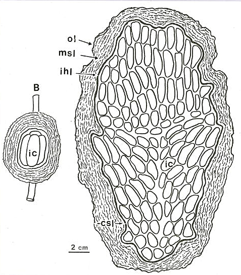 Cross section of an Anaphe nest. The individual cocoons of each caterpillar (IC) are formed within a communally-built nest. The outer walls of the nest has three descrete layers: an outer layer (ol) a middle layer of loosely spun silk (msl) and a dense, hard inner layer (ihl).