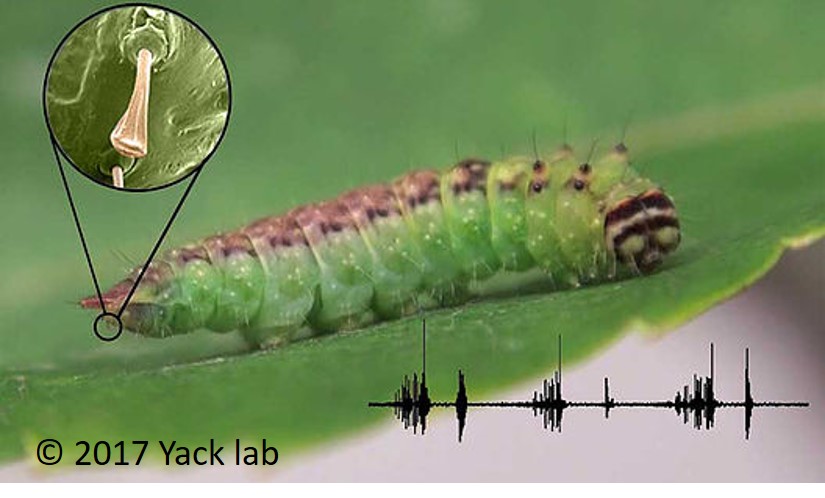 The caterpillar generates four vibrational signals that affect the behavior of conspecifics: anal scraping, mandible druming, mandible scraping, and buzz scraping, the latter produced when the caterpillar vibrates its body while anal scraping.