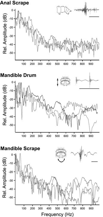 (Right): Frequency spectra for various vibrations produced by D. arcuata on birch leaves.