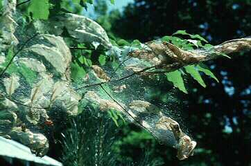 During the first three instars, the caterpillars are patch restricted foragers, confining their foraging activity to a silken web spun over the leaves on which they feed. In the the 4th and subsequent stadia, the caterpillars are central place foragers, leaving the nest to feed at distant sites.