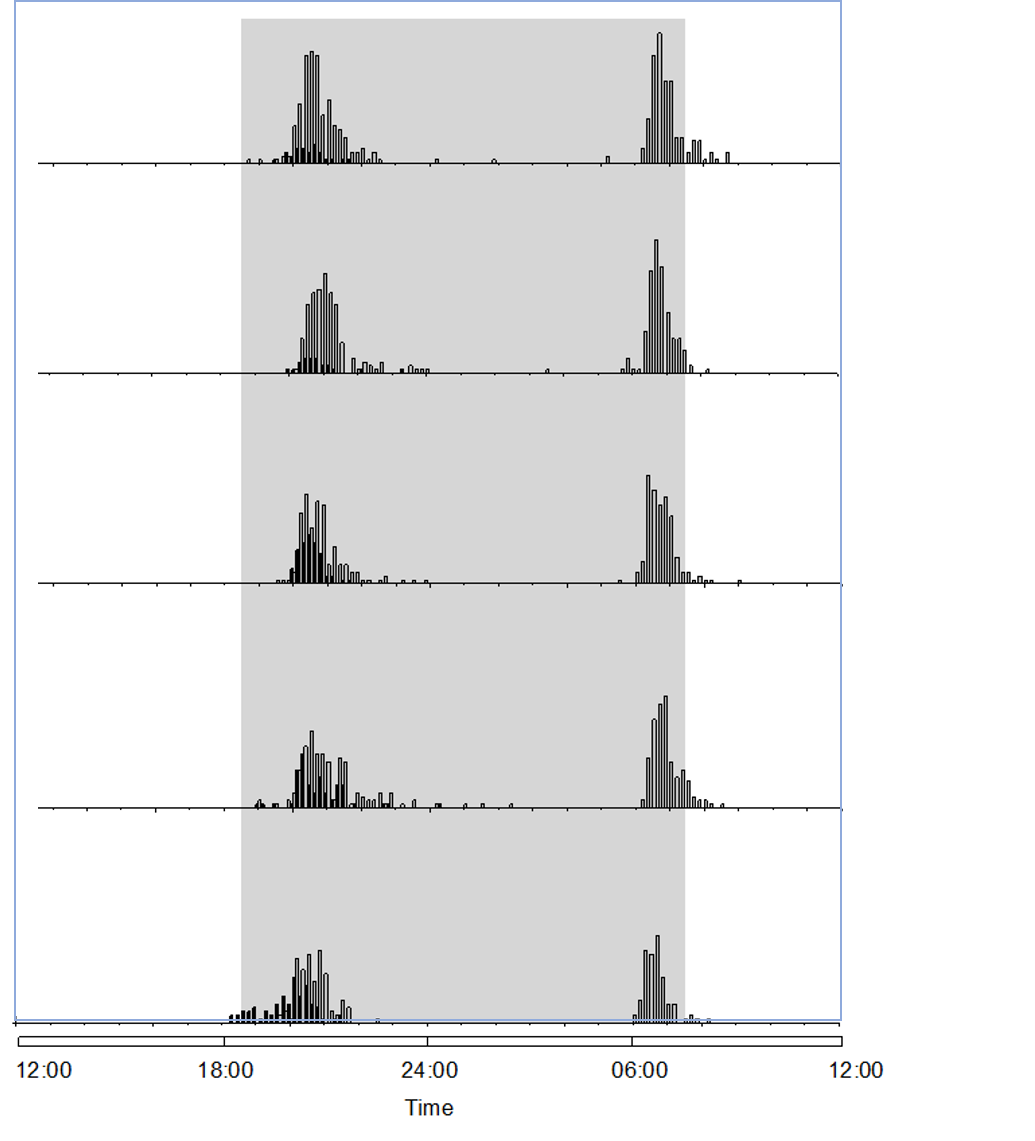 Synchronous foraging activity of 5th instar fall webworm larvae over a five-day period The caterpillars leave the nest at dusk en masse, then, after feeding overnight, return to the nest at daybreak. Nocturnal foraging is likely an adaption that allows caterpillars to avoid day-active predators. (Gray area = nightime)