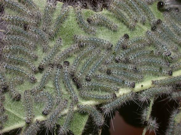 Young caterpillars moving over the surface of a leaf they have been feeding on.