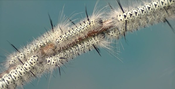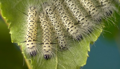 Feeding tussock caterpillars. Notice the silk strand that issues from the tip of the caterpillar's spinneret in the close-up in the last sequence. The strand serves as a lifeline if the caterpillar falls or is dislodged by a predator.