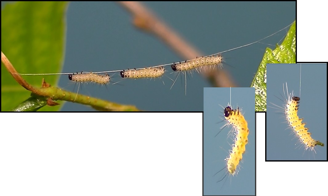 One of the advantages of sociality for caterpillars is that it allows them to pool their silk to make shelters and to enhance steadfastness on the slippery bark surfaces of host plants. The hickory tussock caterpillar is a nomadic forager and does not make three-dimensional shelters. However, the caterpillars are prolific silk spinners and laydown mats and pathways of silk on leaf and bark surfaces. As shown here, the single strand of silk that issues from a caterpillar's spinneret easily supports the weight of the caterpillar. It serves as a lifeline if the insect falls from the tree or jumps to avoid a predator. A fallen caterpillar can climb back up by twisting its body and pulling in the lifeline As shown above and in the video below, the caterpillars are excellent "tightrope" aerialists and can move from place to place over thick rope-like lines constructed from the collected strands of the succession of caterpillars that move over them.