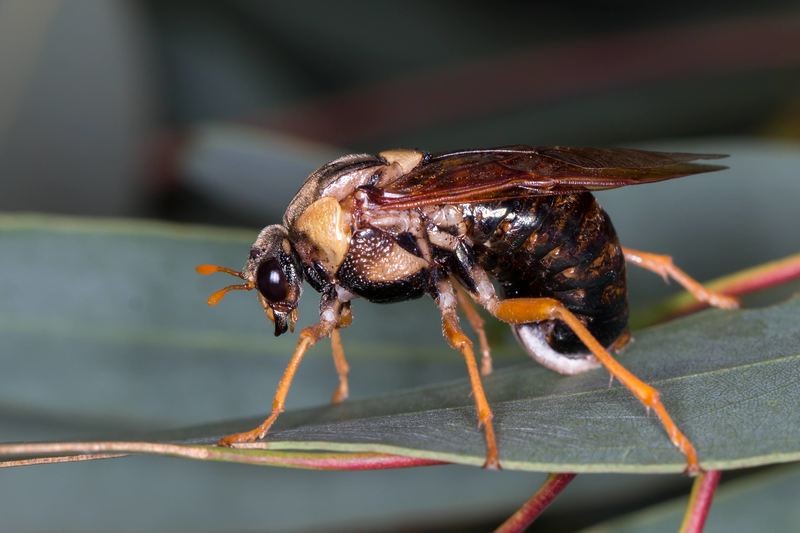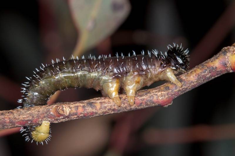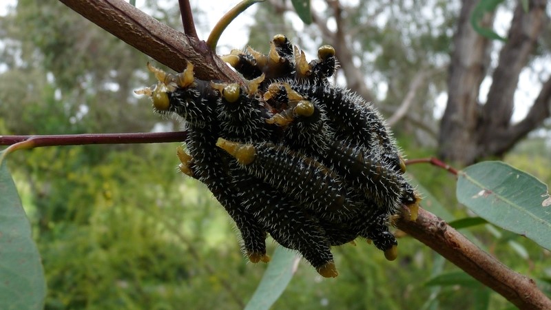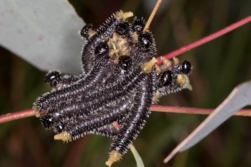 Perga affinis is also known as the Australian spitfire sawfly. The adult female sawfly lays her eggs underneath the surface of leavesl. A single long row of eggs are inserted between the leaf layers, forming a so-called "egg raft". Perga generally hatch from the eggs in the fall, and pass through six larval instars, which lasts three to four months before pupating. All instars are gregarious. The insect is a particularly voaracious consumer of Eucalyptus leaves. When mature, Perga larva leave their host tree and form a cocoon in the soil. Here they remain in a state of diapause for up to four years, before emerging as adults.