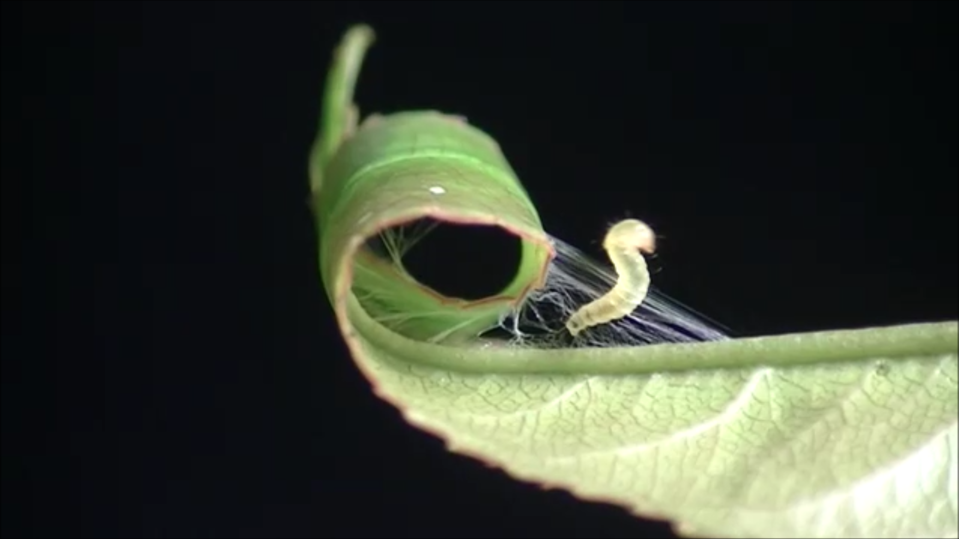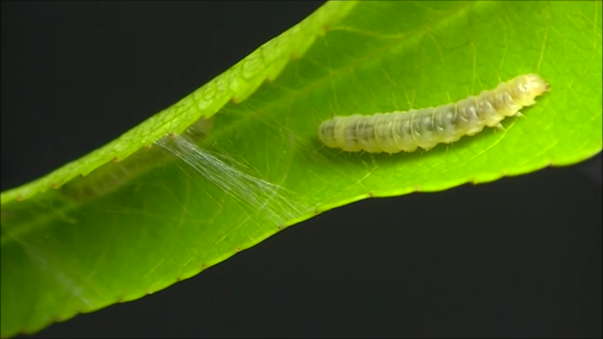The resident Caloptilia caterpillar (larger) drives away an intruder by scraping and plucking its mandibles against the surface of the leaf.